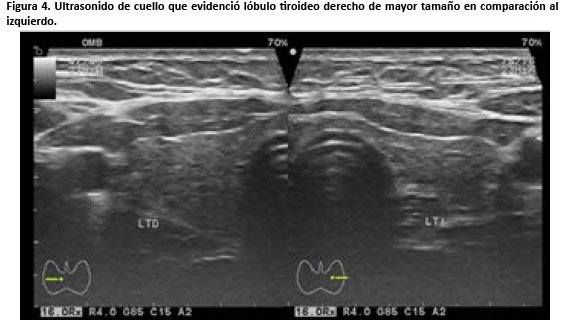 Se realizó abordaje inicial por medio de antropometría, impedancia y plicometria, detectando un Índice de Masa Corporal (IMC) de 37,6 kg/m2, superior a percentil 95% corroborando diagnóstico de obesidad. Debido al hallazgo de vitiligo se decidió realizar perfil tiroideo, justificado por la asociación descrita de patología tiroidea hasta en un 2% de los casos en los pacientes con vitiligo, obteniendo los siguientes resultados (Ver Tabla 1) dentro de los cuales destacó la elevación de anticuerpos anti TPO y niveles disminuidos de hormona Tiroglobulina. Debido a lo anterior, se solicitó ultrasonido de cuello el cual reportó: asimetría de lóbulos tiroideos con un lóbulo derecho de mayor tamaño respecto al izquierdo, patrón granular, considerando datos sugestivos de tiroiditis crónica (Figura 4.).