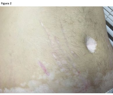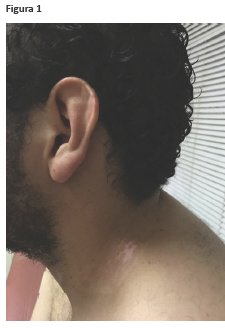 Se trata de paciente masculino de 26 años, soltero, estudiante, de Tegucigalpa-Honduras, acude a consulta por presentar episodios de palpitaciones, debilidad, y disnea de grandes esfuerzos de hace 2 meses; niega fiebre, pérdida de peso, hiporexia, polifagia. En el 2005 fue diagnosticado con vitíligo manejado por dermatología pero tiene 12 meses sin tratamiento, el 2016 con trastornos tiroideos y prediabetes, refiere indicación de levotiroxina que no cumplio. Sin antecedentes de tabaquismo y alcohol. Sin antecedentes familiares de diabetes mellitus ni enfermedad tiroidea, solo una tía materna con hipertensión arterial. Al examen físico: biotipo pícnico, sin facie de enfermedad, lúcido y orientado, con signos vitales y medidas antropométricas: presión arterial 110/70 mmHg, frecuencia cardiaca y pulso 96/minuto, temperatura 37C°, saturación oxígeno 95%, peso 88,4 kg, talla 1,75 cm, índice de masa corporal 29.6 kg/ m2. Al examen segmentario es destacable ver deformidad en ambos pabellones auriculares, obesidad central, perímetro abdominal 98 cm, con áreas de acromía en cara, cuello, axilas, mamas, cintura, y ombligo; sin otras alteraciones, (ver Fig. 1, 2, 3).