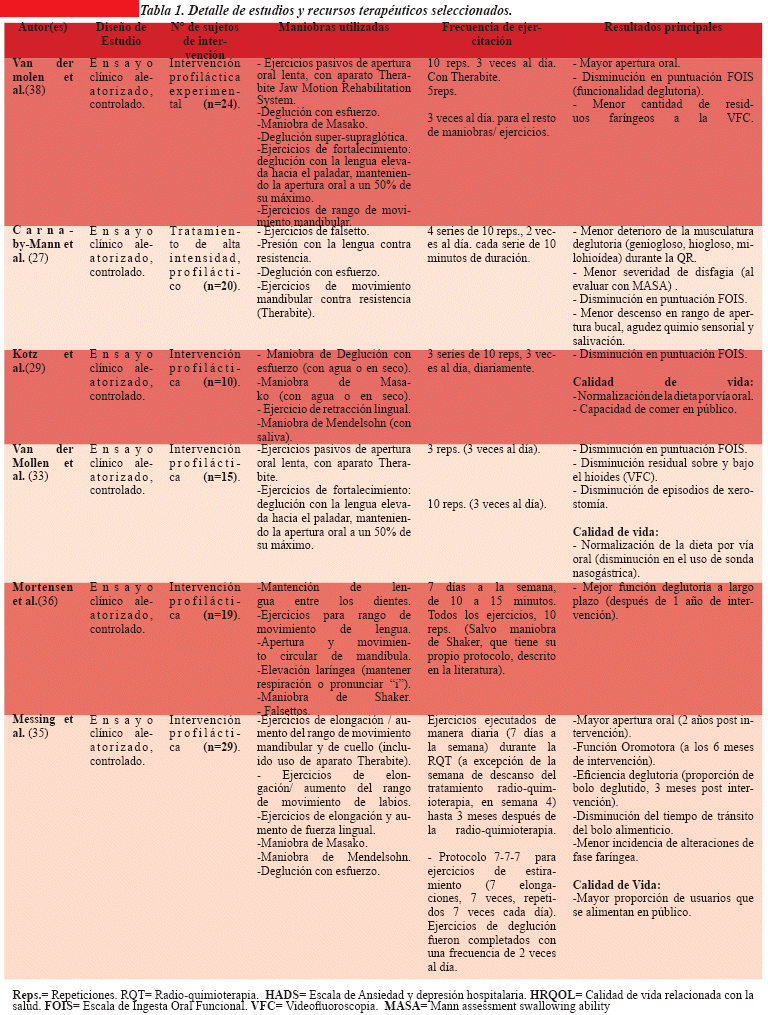 Los resultados expresan cuáles son los ejercicios deglutorios utilizados y recomendados con fin profiláctico en usuarios con CCC y riesgo de presentar disfagia por RT o QR, además de cuál sería la intensidad y duración de la terapia con base en resultados obtenidos en estudios de ensayos clínicos revisados. En ese contexto, la Tabla 1 provee una descripción detallada de cada estudio, los recursos utilizados y el reporte de los principales cambios en los usuarios que se aplicaron.