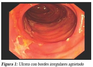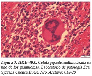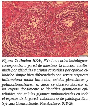 Es el caso de un paciente del género masculino de 43 años de edad procedente del cantón Piñas-Provincia de El Oro-Ecuador y que en enero 2020 acude a consulta médica particular por presentar dolor abdominal tipo cólico localizado en fosa iliaca derecha continuo y poco irradiado, fiebre, fatiga, hiporexia, pérdida de peso desde el inicio de su enfermedad, dolor con la defecación, tenesmo y en ocasiones diarrea. El paciente refiere que este cuadro clínico se ha repetido en cuatro ocasiones anteriores. Se le realizó tratamiento ambulatorio con un diagnóstico previo de infección intestinal y amebiasis. Sin embargo la signo-sintomatología persistía y regresa a consulta, siendo referido al gastroenterólogo quien le practica colonoscopia, observando: colon derecho con úlceras y áreas de mucosa infiltrada, donde se toman muestras para estudio histopatológico (Ver figura 1). Se ordena luego de este procedimiento una TAC abdominal, donde se visualiza engrosamiento de íleon distal y colon derecho con líquido libre laminar en cavidad abdominal. El estudio anatomopatológico identificó ulceraciones que comprometen hasta la subserosa, absceso en las criptas e infiltrado inflamatorio mixto hasta el tejido adiposo (Ver figura 2). Se identifican granulomas epitelioides con células gigantes multinucleadas en todo el espesor de la pared, estableciendo el diagnóstico de Enfermedad de Crohn (Ver figura 3).