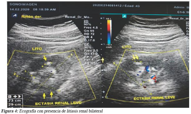 Resumen: Caso de litiasis renal por oxalato de calcio asociado a enfermedad de Crohn de reciente debut en paciente masculino 43 años proveniente del Canton las Piñas, Provincia El Oro en Ecuador, sin antecedentes patológicos en relación a su enfermedad. En enero 2020 acude a consulta particular con dolor en fosa iliaca derecha, fiebre, fatiga, hiporexia, pérdida de peso, tenesmo y diarrea. Gastroenterólogo observó colon derecho con úlceras, áreas de mucosa infiltrada, y el estudio anatomopatológico identifica ulceraciones en subserosa, abscesos, infiltrado inflamatorio mixto, granulomas epitelioides con células gigantes multinucleadas. Previo consentimiento se realiza ecosonografía, detectándose un cálculo renal derecho de 5 mm de tamaño y otro de 4 mm en el izquierdo. El análisis de orina reporta aciduria, cristales oxalato de calcio y la radiografía simple demostró sombra de los cálculos. El estudio metabólico la 1,25 dihidroxivitamina D y la hormona paratiroidea resultó negativo. La evolución fue favorable y continua en control periódico que de ameritar se ordenaría tomografía helicoidal sin contraste o urograma excretorio.