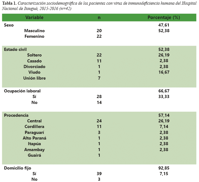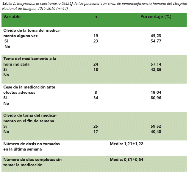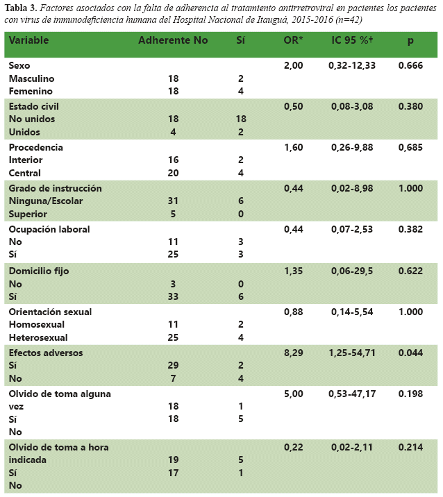 Métodos: Estudio observacional, analítico, corte transversal, muestreo no probabilístico de casos consecutivos. Se incluyeron 42 pacientes infectados con VIH con tratamiento antirretroviral en el Hospital Nacional de Itauguá. Se utilizó encuesta demográfica y cuestionario SMAQ para evaluar la adherencia al tratamiento, para el análisis se realizó la prueba Odds Ratio (OR) y se consideró una p<0,05 como significativa.