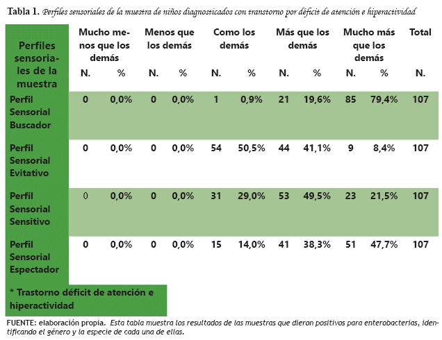 Resultados: De los 107 pacientes con trastorno por déficit de atención e hiperactividad el perfil sensorial buscador se observó los niveles "mucho más que los demás" con 79,4%, el perfil sensorial evitativo "más que los demás" con 41,1 % y "como los demás" con 50,5%. Perfil sensorial sensitivo se observó, "más que los demás" con 49,5%. Así mismo, tenemos el perfil sensorial espectador, se observó los niveles "mucho más que los demás" con un 47,7%.