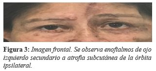 Hay muchas manifestaciones oftalmológicas asociadas, incluyen enoftalmos, vasculitis retiniana, paresia / parálisis del tercer nervio, glaucoma o atrofia del párpado15. En este caso se presentó enoftalmos izquierdo (Figura N°3), acompañado con el síndrome de ojo seco ipsilateral, eritema conjuntival, provocado por atrofia y disfunción de las glándulas lagrimales, con fotosensibilidad. El SPR se puede acompañar de alteraciones neurológicas: patología vascular cerebral, epilepsia refractaria, cefalea intensa, trastornos del movimiento o síntomas neuropsicológicos6,14:las cuales no se manifestaron en la paciente.