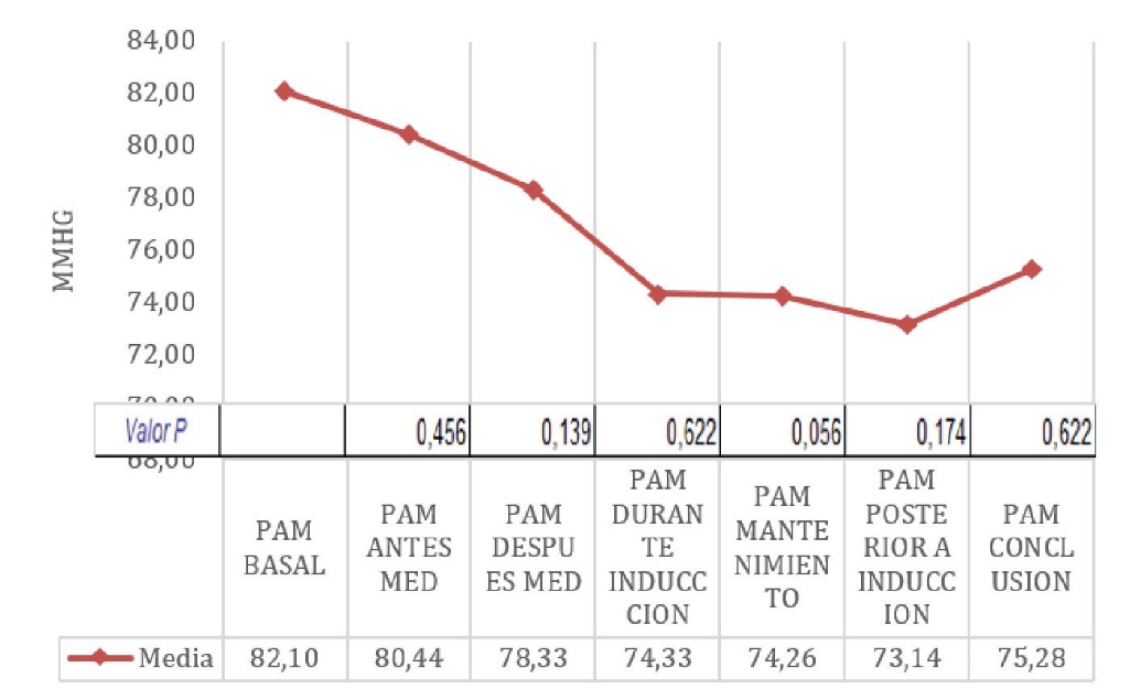 Mientras que, la presión arterial media basal fue de 82 ± 3,8 mmHg; la presión arterial a los 45 minutos de administrado la dexmedetomi- dina intranasal se obtuvo de 78 ± 6 mmHg; la presión arterial media durante la inducción, mantenimiento y al concluir el procedimiento se mantuvo entre 73 a 75 mmHg, no siendo significativos (valor p de 0,6; 0,05 y 0,8 de manera respectiva). Ver figura 2