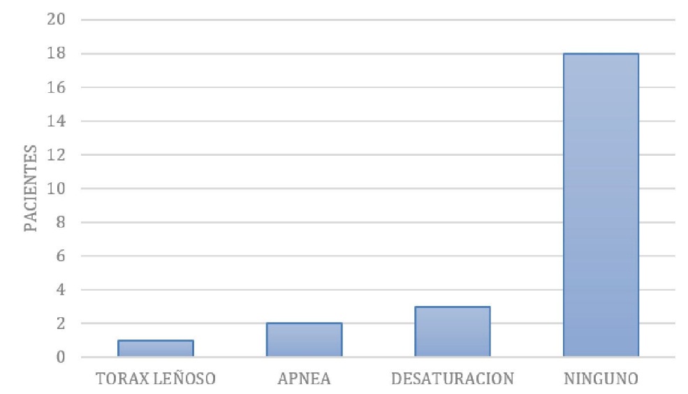Las complicaciones que se registró posterior a la inducción, 3 (12,5 %) pacientes presentaron desaturación; un paciente presento tórax leñoso equivalente a 4,2 %; dos (8,3 %) pacientes presentaron episodios de apnea y el 75 % de las pacientes no presentaron ninguna complicación. Ver figura 3