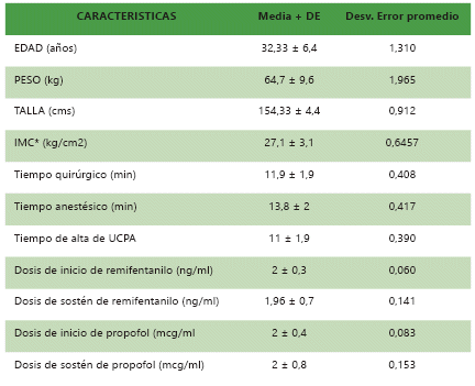 Para empezar, la edad media del grupo de estudio es de 32 ± DE 6 años; peso de 64 ± DE 9 kilogramos; talla de 154 ± 4 centímetros y con Indicé de Masa Corporal de 27 ± 3 kg/cm2. El tiempo quirúrgico fue de 11 ± 1,99 minutos; el tiempo anestésico se encontró en 13 ± 2 minutos; el tiempo del alta de la sala de cuidados postoperatorios (UCPA) fue de 11 ± 1,9 minutos. En cuanto, a la dosis de inicio y sostén de remi- fentanilo fue de 2 ± 0,3 ng/ml y 1,9 ± 0,7 ng/ ml; por su parte, la dosis de inicio y sostén de propofol fue de 2 ± 0,4 mcg/ml y 2 ± 0,8 mcg/ ml, con respecto al valor p fue significativo 0,00 para ambos medicamentos en ambas etapas de inducción y mantenimiento. Ver tabla 1.
