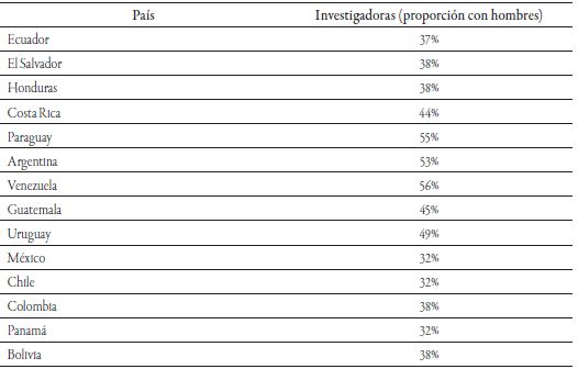 En Latinoamérica, la proporción de mujeres investigadoras en relación con los hombres ha llegado a 44 por ciento. En otras palabras, de cada 100 investigadores, 44 son mujeres. Aunque efectivamente esta cifra no es baja, sí resulta alarmante cuando se analiza la desigualdad que implica este porcentaje en la región latinoamericana. Basados en el cuadro 1, acerca de la brecha de género en la investigación, hay países que destacan más que otros; por ejemplo, Paraguay (55 por ciento), Argentina (53 por ciento), Venezuela (56 por ciento) llevan el liderazgo en la paridad de género en investigación en la región, con respecto de otros países de la misma región, como Chile (32 por ciento), México (32 por ciento), Colombia (38 por ciento), Honduras (38 por ciento).
