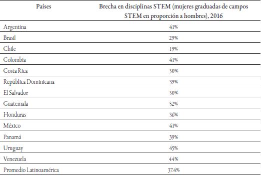 Información semejante es la que ofrece el World Economic Forum en su Reporte de Brecha de Género 2016 (WEF, 2016). Aunque refiere una mejora de la situación de la mujer en general con respecto de la proporción de hombres, en algunos países de la región (como Argentina, Costa Rica y Panamá) esto no implica analógicamente que haya mejorado su participación en los campos de STEM. Al contrario, países como Uruguay (45 por ciento) y Venezuela (44 por ciento) presentan una considerable paridad en la proporción entre hombres y mujeres en la brecha de personas graduadas en áreas de STEM, aunque en algunos otros aspectos como la participación política o económica aún tengan condiciones por mejorar (Vázquez Parra, Arredondo Trapero y De la Garza, 2016).