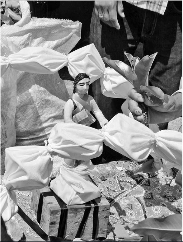 Una vez que llegan a las orillas, las estatuas son colocadas en un pequeño altar depositado sobre la arena. En este momento, los presentes empiezan a entregar ofrendas al santo: de nuevo entregan algodón y flores; también, velas, monedas y algunos billetes. La afluencia de fieles es tanta que los mayordomos que cuidan al santo todo el tiempo tienen que retirar las ofrendas que se entregan y guardarlas en unos costales. Mientras se entregan las ofrendas, varios grupos de músicos se alternan para tocarle al santito.