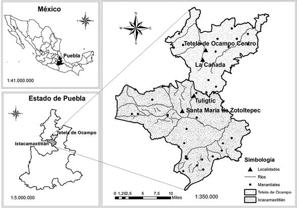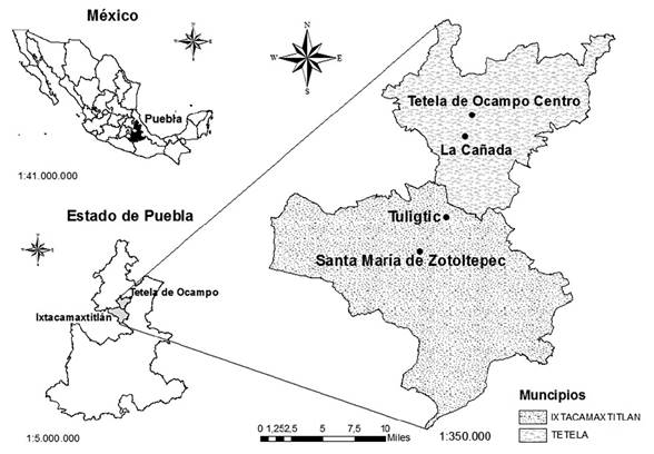Se seleccionaron cuatro comunidades que estuvieran dentro de la zona de influencia de los proyectos Ixtaca y Espejeras. Las comunidades se escogieron por la cercanía al proyecto minero y por el avance de los proyectos con respecto de los demás existentes en la región. Las comunidades de estudio en Ixtacamaxtitlán son Santa María de Zotoltepec y Tuligtic; para el municipio de Tetela de Ocampo son La Cañada y Tetela de Ocampo Centro. En el mapa 1 se muestra la ubicación geográfica de estas.