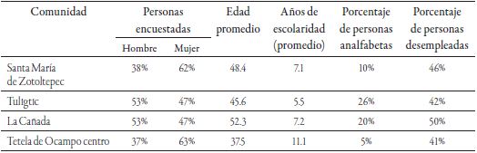 En las cuatro localidades estudiadas se encontró que habitan cuatro personas en promedio por hogar; 99 por ciento tiene el español como lengua materna y solo uno por ciento habla náhuatl. En el cuadro 1 se muestran las características de la población encuestada por comunidad. En Santa María y Tetela de Ocampo Centro, más de 60 por ciento de las personas encuestadas son mujeres; el promedio de edad oscila entre 37.5 y 52.3 años, edades en que las personas están en condiciones de trabajar y normalmente ya han conformado una familia.