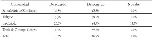 Acerca de si están de acuerdo en que los proyectos mineros se instalen en los municipios, se probó que hay diferencias significativas entre los encuestados en las cuatro comunidades (C2=26.8; p<0.001). En la Cañada, como se aprecia en el cuadro 2, las personas mayores que atendieron la encuesta trabajaron u obtuvieron su patrimonio gracias a la industria minera que se desarrolló en el siglo pasado. A pesar de la cercanía geográfica entre Tetela de Ocampo Centro y La Cañada, la industria minera generó mayores beneficios económicos en las familias que vivían en La Cañada. Las personas encuestadas en La Cañada que no tienen una posición definida acerca de la conveniencia de la instalación de la mina mostraron temor de decidir acerca del tema.