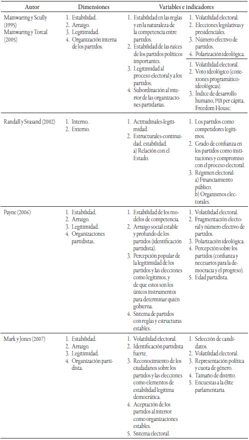 El análisis del sistema de partidos institucionalizado prevé distintos elementos para la construcción de herramientas teórico-conceptuales. En este sentido, Randall y Svasand (2002), Payne (2006), Mark Jones (2007), Altman et al. (2009), Rose y Mishler (2010), Hicken y Kuhonta (2011), Croissant y Völkel (2012), Zucco (2013), Torcal (2015), siguiendo a Mainwaring y Scully (1995, pp. 1-2) , señalan que el grado de institucionalización “es un importante indicador de la estabilidad o inestabilidad, continuidad y cambio, no sólo del sistema de partidos sino del sistema político en general”. Mainwaring y Scully (1995) son enfáticos al señalar que el grado de institucionalización del sistema partidario se encuentra a favor de la estabilidad de las normas de competencia y del comportamiento partidista, y no necesariamente por los aspectos democráticos del sistema político particular, más si es un condicionante para que este sea más estable y actúe en favor de su desarrollo. Para Mainwaring y Scully (1995), la institucionalización del sistema de partidos: