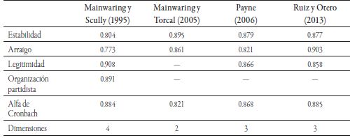 Para facilitar un análisis más acabado sobre la construcción de los diversos índices que determinan el grado de institucionalización del sistema de partidos, se revisan cuatro índices aplicados a la realidad latinoamericana. La diferencia entre los índices de institucionalización del sistema de partidos en América Latina se puede apreciar en el Cuadro 2, en el que se observan los efectos de cada una de las dimensiones sobre el ISP utilizados en diferentes trabajos desde 1995 hasta 2013. Como se puede apreciar, los factores mostrados por el Alfa de Cronbach7 manifiestan que de los cuatro índices aplicados a la realidad latinoamericana, los índices de Mainwaring y Scully (1995) y Ruiz y Otero (2013) poseen mayor consistencia analítica entre las dimensiones que lo conforman y, con ello, mayor coherencia entre sus dimensiones y variables. No obstante, el índice de Payne (2005) muestra resultados similares aunque inferiores; manifiesta una consistencia alta en sus factores (variables) componentes. Por debajo se ubica el índice de Mainwaring y Torcal (2005), pese a lo cual manifiesta una alta fiabilidad y consistencia analítica.