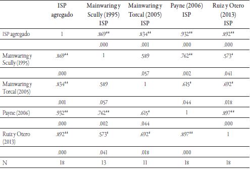 Como se aprecia en el Cuadro 3, los índices manifiestan altos niveles de correlación estadística; no obstante, el de mayor capacidad explicativa en el índice de ISP agregado es el índice de Payne (2006); por debajo se encuentran los de Ruiz y Otero (2013), Mainwaring y Scully (1995); en tercer lugar y finalmente, el índice de ISP de Mainwaring y Torcal (2005). La asociación entre los cuatro índices manifiesta la misma relación. Destaca el índice de Payne (2006), el cual manifiesta mayores efectos estadísticos con los demás indicadores analizados. En este sentido, la información obtenida por las pruebas de fiabilidad y consistencia y las correlaciones estadísticas muestran que el índice de institucionalización que tiene mayor capacidad explicativa es el de Payne (2006). A pesar de lo anterior, tanto el índice de ISP de Ruiz y Otero (2013), Mainwaring y Scully (1995) como el de Mainwaring y Torcal (2005) tienen una alta capacidad explicativa. La razón teórica y metodológica de dichos resultados obedece a las diversas conformaciones de los índices e indicadores utilizados por los autores. Por un lado, las dimensiones utilizadas en los diversos índices son las creadas por Mainwaring y Scully (1995); en consecuencia, las variables asumen un valor preponderante en cada medida, no así los indicadores que se conforman según las fuentes de datos y las herramientas de obtención de información. Por otro lado, el auxilio que brindan las relaciones instrumentales y contextuales con los procesos de institucionalización de los sistemas promueve un ejercicio descriptivo diacrónico y comparable.