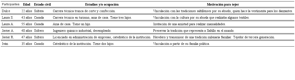 Los participantes fueron seleccionados de manera no probabilística (Taylor y Bogdan, 1984). Se trabajó con seis tejedores, tres mujeres y tres hombres, de un rango de edad de 22 a 55 años; de ellos, dos son maestros de la Escuela. En el cuadro 1 se muestran los datos sociodemográficos y las motivaciones para comenzar a tejer.