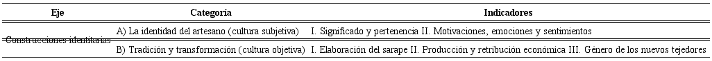 En este artículo, nos situamos en miradas teóricas constructivistas y relacionales, ya que damos prioridad a las prácticas identitarias, a la narración de las y los tejedores y a los símbolos y significados que les da el convertirse en maestros obrajeros. Para ello, nos centramos en las prácticas que las y los tejedores mantienen alrededor de la elaboración del sarape; nos interesa el proceso de construcción porque eso es justamente lo que los hace ser y pertenecer. Las categorías de análisis son: a) la identidad del artesano compuesta por dos indicadores: el significado y la pertenencia, y las emociones, motivaciones y sentimientos, y b) la tradición y las transformaciones, que incluyen la elaboración del sarape, el género de los tejedores y la producción y retribución económica.