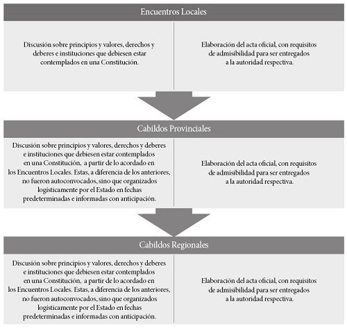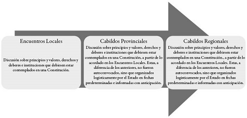 El proceso consideró tres grandes momentos: el encuentro, la deliberación y la soberanía. La etapa de participación ciudadana (el encuentro), según informó el propio Poder Ejecutivo, se desarrollaría (y desarrolló) de la siguiente forma, todo supervisado por el denominado Consejo Ciudadano de Observadores:4