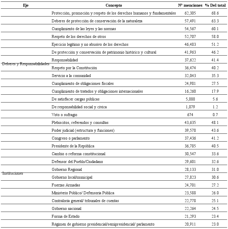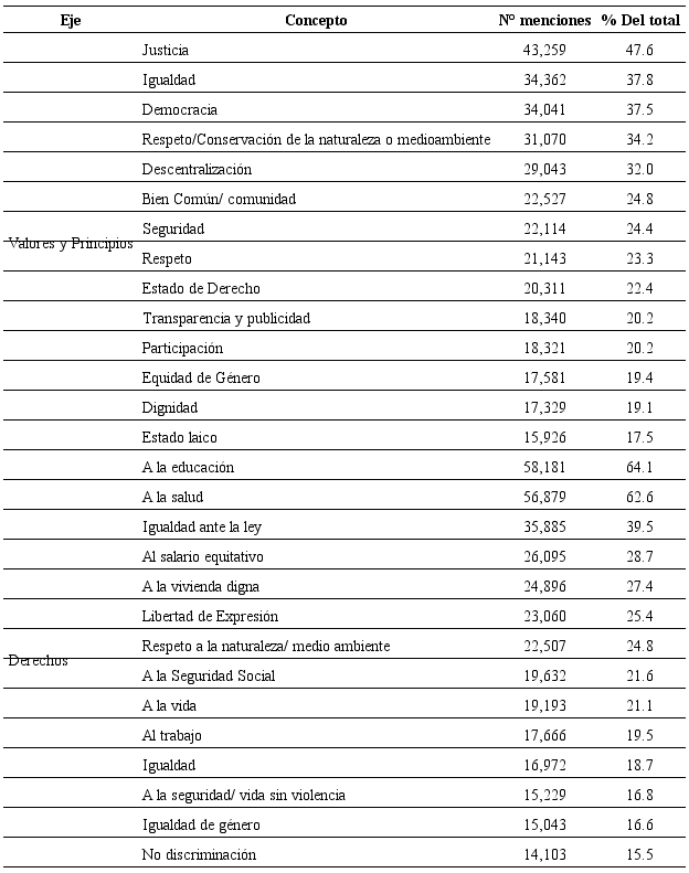 En cada instancia, individual o colectiva, se solicitó mencionar (y justificar la razón de la mención) solamente siete elementos referidos en cada uno de los ejes. El Comité de Sistematización, a efectos de suministrar mayores insumos al proceso constituyente, contabilizó por cada cual una mayor cantidad de conceptos (Comité de Sistematización, 2017).