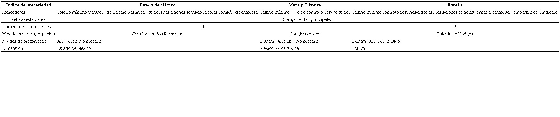 Estas variables se han seleccionado porque, en conjunto, abarcan las tres dimensiones que definen la precariedad laboral en la presente investigación y que han sido elegidas por ser abordadas en los trabajos de algunos expertos en el tema (Rodgers, 1989; Oliveira, 2009; Rubio, 2010; Mora, 2011; Guadarrama, 2012); además, estas dimensiones reflejan la calidad de los empleos de los trabajadores asalariados mexiquenses.