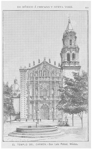En la página 113 de la conocida obra De México a Chicago y Nueva York. Guía para el viajero en que se describen las principales ciudades y ferrocarriles de México y los Estados Unidos del Norte, escrita por Adalberto de Cardona, publicada en 1892, se incorporó el grabado con el pie: “El templo del Carmen. San Luis Potosí. México” (véase la imagen 1b). Como la mayoría de las imágenes de ese libro y otros muchos de finales del siglo XIX, ese grabado aparece sin que se indique quién es su autor; sin embargo, es fácil llegar a la conclusión de que la base para la creación de ese grabado fue la fotografía de William Henry Jackson “3969. Church of Carmen, San Luis Potosi, Mexico”. Ambas imágenes coinciden en múltiples detalles, salvo en solo dos diferencias en el contenido del grabado publicado por Cardona.