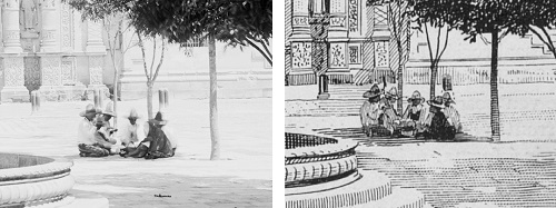 Insistimos en que podemos ver diversos detalles en las imágenes gracias a la alta definición de los archivos puestos en la red por la Biblioteca del Congreso. Por lo anterior, somos capaces de observar claramente que el artista autor del grabado modificó una escena de la fotografía y que suprimió un detalle. En ambas imágenes (fotografía y grabado) vemos el grupo de personas que se encuentra plácidamente comiendo en la plaza frente a la iglesia (véase la imagen 2), pero solo en la fotografía podemos apreciar que la única mujer del grupo, la que reparte -o muy probablemente vende- la comida, se encontraba en movimiento en el momento de la toma, lo que provocó que apareciera como un barrido en la foto. El autor del grabado tenía varias posibilidades para “arreglar” esa parte de la imagen. Podría restituir la figura de la mujer repartiendo la comida -congelar su movimiento en un gesto que mostrara su importante actividad-, también pudo eliminar toda la escena o suprimir la figura de la mujer, pero lo que hizo, porque quizá le resultó más fácil, fue sustituir la imagen de la mujer por la de otro comensal… ¡masculino!