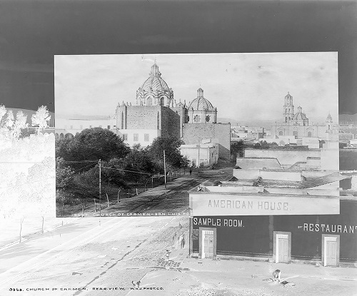 Lo que se reseñará a continuación es posible gracias a un acto de magia y a una concepción acerca del patrimonio documental. Aunque se confunden, es preciso referirlos por separado. En cuanto a los efectos de poner en línea y sin candados imágenes de alta resolución, esta práctica de difusión del patrimonio hace posible el análisis en detalle de un grupo conveniente de imágenes. Al hacer el registro de la imagen “3969. Church of Carmen, San Luis Potosi, Mexico”, William Henry Jackson captó información que no era perceptible a simple vista. Nosotros tampoco la veríamos si solamente tuviéramos imágenes digitales de baja resolución, pero resulta que una buena práctica de acceso a la información fotográfica (algo casi de magia en estos tiempos) permite que aparezca el verdadero mago.