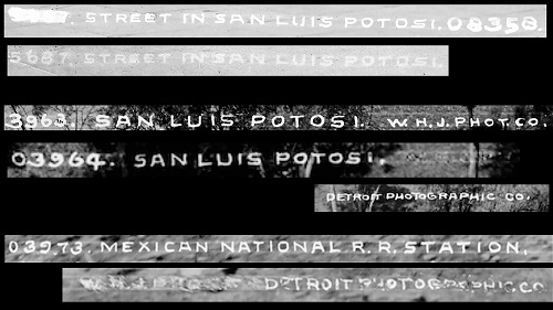 A un ciclo de producción anterior de objetos fotográficos corresponden los positivos que se han localizado en la Fototeca Nacional que contienen números anotados que rondan alrededor del 5682 al 5700. La fotografía de la Fototeca Nacional con número de inventario 429081 tiene la leyenda “5687. Street in San Luis Potosí” (véase la imagen 4), mientras que el negativo con la misma imagen de la Biblioteca del Congreso se singularizó con la leyenda “8358. Street in San Luis Potosí”, pero en este objeto se puede observar que, aunque se intentó borrar, todavía es posible leer el número 5687 en la parte izquierda de la leyenda (véase la imagen 5). Se afirma que fueron modificaciones hechas después de 1897, porque, aunque en algunos de estos negativos persiste la firma “W. H. Jackson”, en otros simplemente se borró y en otros más se incorporó la marca de la nueva compañía que se hizo cargo de los negativos a partir de ese año, “Detroit Photographic Co” (véase la imagen 5).