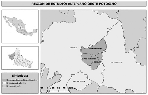 La región altiplano oeste potosino (AOP) está compuesta por los municipios de Salinas (S), Villa de Ramos (VR) y Santo Domingo (SD), con una población de 80 161 personas, las cuales se concentran en 259 localidades, donde 98.8 por ciento (256) de estas cuentan con menos de 2 500 habitantes (INEGI, 2010). Al tener una extensión de 10 529 kilómetros cuadrados, representa 17.16 por ciento de la superficie estatal. Al oeste colinda con el estado de Zacatecas, al este con los municipios de Real de Catorce, Charcas, Venado y Moctezuma (véase la figura 1). Su altitud promedio es de 2 084 metros sobre el nivel del mar, y su temperatura promedio fluctúa entre los 16 y 18 grados centígrados, con una precipitación fluvial promedio de 300-500 milímetros. Sus suelos predominantes son Phaeozem y Calcisol (INEGI, 2009).