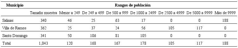 Bajo estos parámetros se calculó el tamaño de la muestra para cada uno de los municipios. La suma de estas arrojó el tamaño total de la muestra (1 043). Como se aprecia en el cuadro 1, una vez calculado el tamaño, se distribuyó en siete rangos propuestos por el Instituto Nacional de Estadística y Geografía (INEGI) de acuerdo con el tamaño poblacional de las localidades según el municipio.