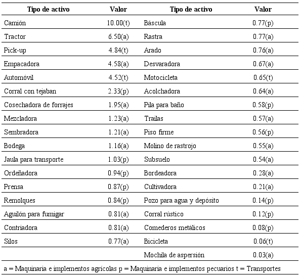 Para los activos referentes a maquinaria e infraestructura utilizadas en las fincas de los encuestados, se consideraron los precios promedio de la maquinaria agrícola, pecuaria, implementos e insumos del listado oficial de la SAGARPA para la ponderación de cada uno. En el caso de los activos de transportes, los precios son los corrientes al año 2015, de los cuales se promedió y asignó un valor estimado a cada uno de los bienes referidos por el encuestado. En el cuadro 3 se concentra la ponderación correspondiente a los activos mencionados dentro del estudio.