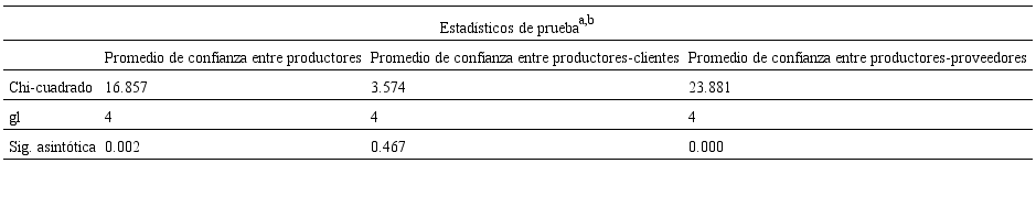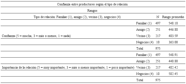 El primer análisis consistió en la búsqueda de diferencias en los niveles de confianza entre los productores según el tipo de relación que manifestaron con el productor referido. Se utilizó un análisis de varianza unifactorial por rangos de Kruskal Wallis para la comparación de tres o más muestras independientes con un nivel de significancia de 0.05 (Field, 2009).