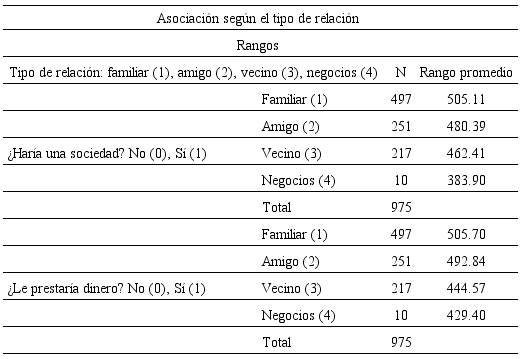 Para el primer análisis, se observaron diferencias en los niveles de confianza demostrados en los distintos tipos de relaciones (X2= 70.68, gl=3, p<0.05). La relación de tipo familiar resultó con el mayor nivel de confianza; seguida por la relación de amistad, vecindad y, finalmente, de negocios.