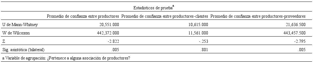 Acerca de la relación productor-productor, los encuestados que dijeron pertenecer a una asociación mostraron mayores niveles de confianza con respecto de los que no pertenecen (z = -2.822, p < 0.05). En el caso de los productores que mantienen una relación con sus proveedores también hubo diferencias; son mayores los niveles de confianza en quienes están asociados que en los que no lo están (z = -2.795, p < 0.05).