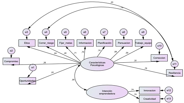 Por otra parte, en el cuadro 6 se muestra la relación entre cada uno de los factores para cada variable. Se observa que la variable latente de intención emprendedora se encuentra explicada por los factores de innovación y creatividad con un nivel de significancia igual (.74). Mientras que los factores que más explican la variable de características psicológicas es la resiliencia, con un nivel de significancia de .781; seguida del factor planificación, con un nivel de significancia de .739, y el factor fijar metas, con un nivel de significancia de .715.