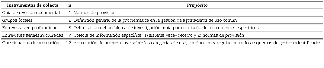 Se hizo uso de un enfoque de investigación inductivo; este se refiere a un proceso etnográfico que explora, examina y entiende los mecanismos de aprovechamiento colectivos de los agostaderos de uso común. Se partió de la colecta de datos cuantitativos y cualitativos, que se analizaron posteriormente, bajo los siguientes supuestos entre los ejidatarios: interacción regular durante cierto tiempo, representación conjunta de una forma de vida y un fin común (Hernández, Fernández y Baptista, 2014). La información utilizada en el análisis se obtuvo a partir de los instrumentos de colecta que se resumen en el cuadro 1.