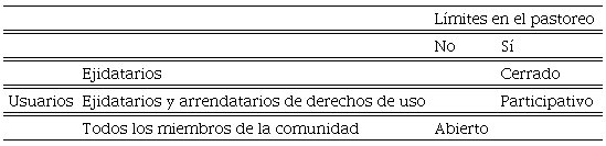 El esquema abierto se maneja en los agostaderos de El Carmen y La Sabinita, que representan el 16.6 por ciento de los ejidos estudiados. Las hectáreas de uso común que tienen asignadas por ejidatario son 0.69 y 5.67, respectivamente. En el ejido de El Carmen, las tierras de uso común representan 11 por ciento de la superficie de este. En este escenario, los costos de transacción son altos y la contribución marginal es limitada, principalmente porque los usuarios requieren disponer de recursos para la supervisión de un pastizal pequeño que ofrece pocos beneficios para el grupo (Crépin y Lindahl, 2009; Ostrom, 2010).