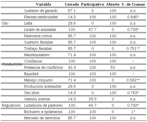 En la categoría de uso, las variables estadísticamente significativas son plantas medicinales y límite de animales. La asociación es fuerte en ambos casos, pues el valor de V de Cramer está por encima de 0.6. Es decir, en los esquemas abierto y participativo hay una alta tendencia a la recolección de plantas medicinales, mientras que la fijación de un límite máximo de animales que pastar se asocia fuertemente con los esquemas cerrado y participativo.