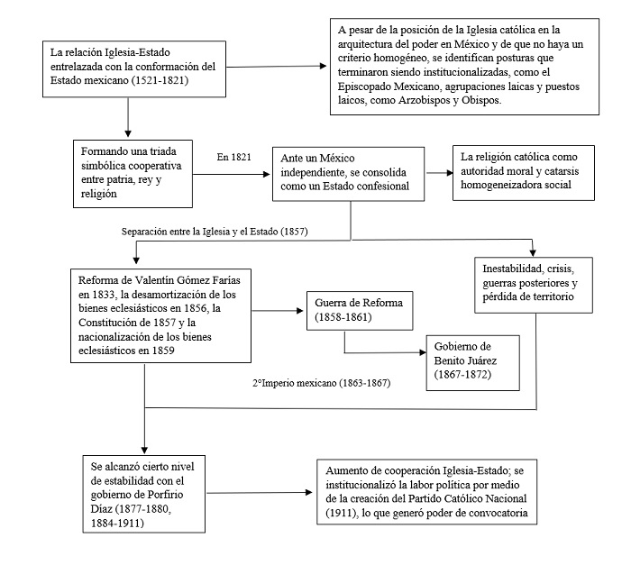 Como se puede observar en la figura 1, México ha pasado por procesos de secularización y laicización que han conducido a la necesidad de posicionar el papel que han tenido los fieles laicos desde finales del siglo xix. Estos se convirtieron en actores clave de la participación política por parte del Episcopado mexicano como miembros del clero. Mantenían la pugna por su derecho a la participación política y democrática del país; no obstante, sus acciones públicas recayeron en esta figura de organizaciones civiles autónomas, pero que configuraban el mismo coto de poder. De esta forma, se volverían los brazos políticos del cuerpo eclesiástico de la institución católica.