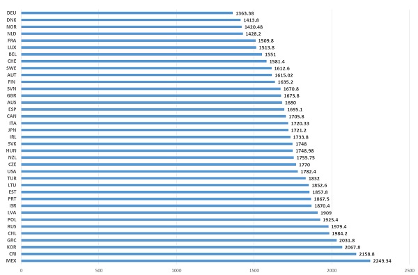 De acuerdo con la Organización para la Cooperación y el Desarrollo Económicos (OECD, 2018), el país que registró el menor número de horas trabajadas por individuo durante 2018 es Alemania, con un promedio aproximado de 1 363 horas, seguido de Dinamarca, con 1 408 horas. En este mismo aspecto, México ocupa el primer lugar, con el mayor número de horas trabajadas en un año (véase la figura 1), con un promedio de 2 249.30.