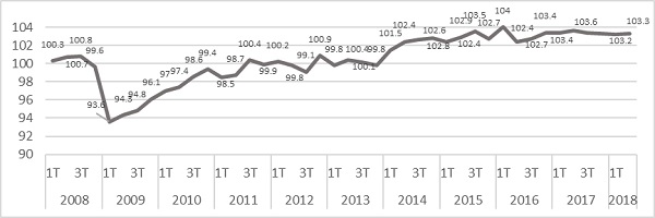Por otro lado, el índice global de productividad laboral de la economía (IGPLE) es una serie temporal estadística que relaciona el producto interno bruto con el índice de horas trabajadas, y permite medir la evolución de la producción comparándola con la variación de los insumos laborales empleados en el proceso productivo. En la figura 2 se grafica el comportamiento de este índice durante 10 años, de 2008 a 2018, tiempo en el que se manifestó un ritmo lento en el crecimiento económico y productivo del país, pues solo avanzó 3.00 por ciento, lo que representa 0.30 por ciento de la tasa anual del IGPLE. De manera que México no ha logrado mantener el parámetro de crecimiento de la productividad laboral recomendado por el McKinsey Global Institute, referido por Galindo y Ríos (2015), equivalente a una tasa anualizada de 4.80 por ciento. En resumen, entre los países pertenecientes a la Organización para la Cooperación y el Desarrollo Económicos (OCDE), México es el que menor productividad presenta con relación al producto interno bruto por hora trabajada.
