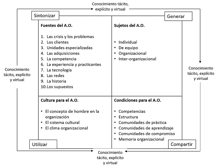 Con relación al componente de aprendizaje organizacional, de los ocho modelos analizados (véase el cuadro 2), se determina que la propuesta de Garzón Castrillon (2008) incluye, en sus cuatro variables -fuentes, actores, condiciones y cultura para el aprendizaje organizacional-, aquellas que se encuentran también en la mayoría de los modelos analizados. Además, la constitución del modelo de Garzón Castrillon (2008) involucra el proceso de conversión del conocimiento de Nonaka y Takeuchi (1999), con lo que lo alinea a la sintonización de fuentes de aprendizaje organizacional, las cuales pueden surgir durante el diagnóstico organizacional. Con esta última condición, igualmente el modelo de Crossan, Lane y White (1999) guarda una estrecha coincidencia.