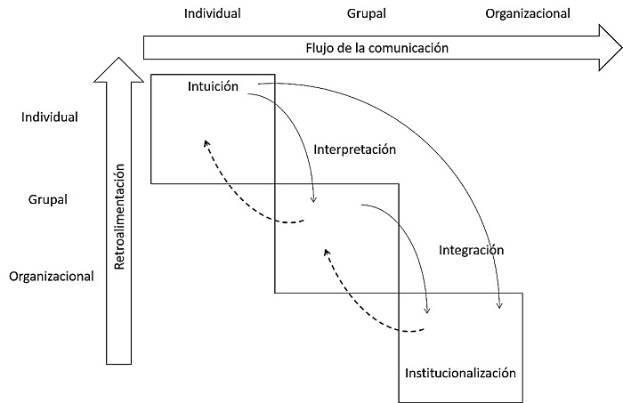 Celemín Pedroche (2011) sostiene que el modelo de las 4 I de Crossan, Lane y White (1999) está dirigido hacia la renovación estratégica. Este se compone de cuatro procesos sociopsicológicos, que son la intuición, la interpretación, la integración y la institucionalización, que suceden en los tres actores del aprendizaje: individual, grupal y organizacional. La misma autora explica que el proceso de intuición se manifiesta en el nivel individual; la interpretación está presente tanto en el nivel individual como en el grupal; la integración se manifiesta en los niveles grupales y organizacionales, y, por último, el proceso de institucionalización se desenvuelve en el organizacional (véase la figura 4).