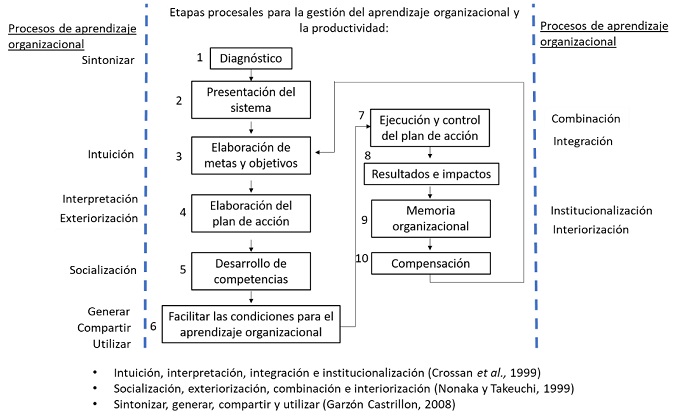 A la luz de los argumentos antes presentados, se manifiesta la compaginación orgánica entre el modelo teórico de aprendizaje organizacional y las etapas que deberán incluirse en el método para la gestión de la productividad. Por esta razón, se determinó que la propuesta de Garzón Castrillon (2008) y el modelo de Crossan, Lane y White (1999) resultan los más adecuados para su inclusión en la propuesta metodológica del presente trabajo.