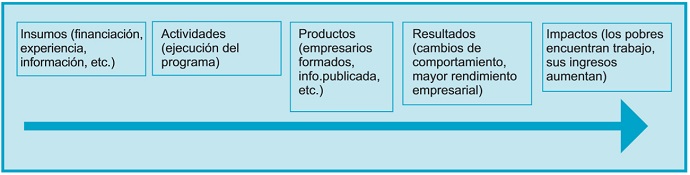 Para la determinación de resultados e impactos, el PROGAP se apoya en el modelo causal del Centro Internacional de Formación de la Organización Internacional del Trabajo (Tanburn, 2008), el cual permite identificar los productos y los resultados que se habrán de alcanzar con el programa. Solo deberá medirse el objetivo alcanzado en cada etapa y señalar que ese logro es el resultado de la culminación de la etapa antecedente. En la figura 6 se sintetiza dicho modelo.