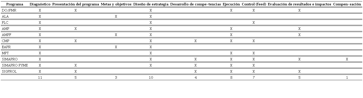 Acerca de los programas y métodos para la gestión de la productividad en las organizaciones revisados (véase el cuadro 1), por medio de una tabla de interpolación, fue posible identificar aquellas etapas en su constitución que presentan mayor ocurrencia, como el caso de la etapa de diagnóstico, que está presente en todos los programas revisados; seguida de la etapa del diseño de estrategia, que se encuentra en 10 de los 11 programas. Sin embargo, el equipo de trabajo que presenta este epígrafe determinó que de todos los programas solo uno (SIMAPRO) incluye la compensación, pero el apartado de memoria organizacional se encuentra ausente en 100 por ciento de los programas y métodos revisados.
