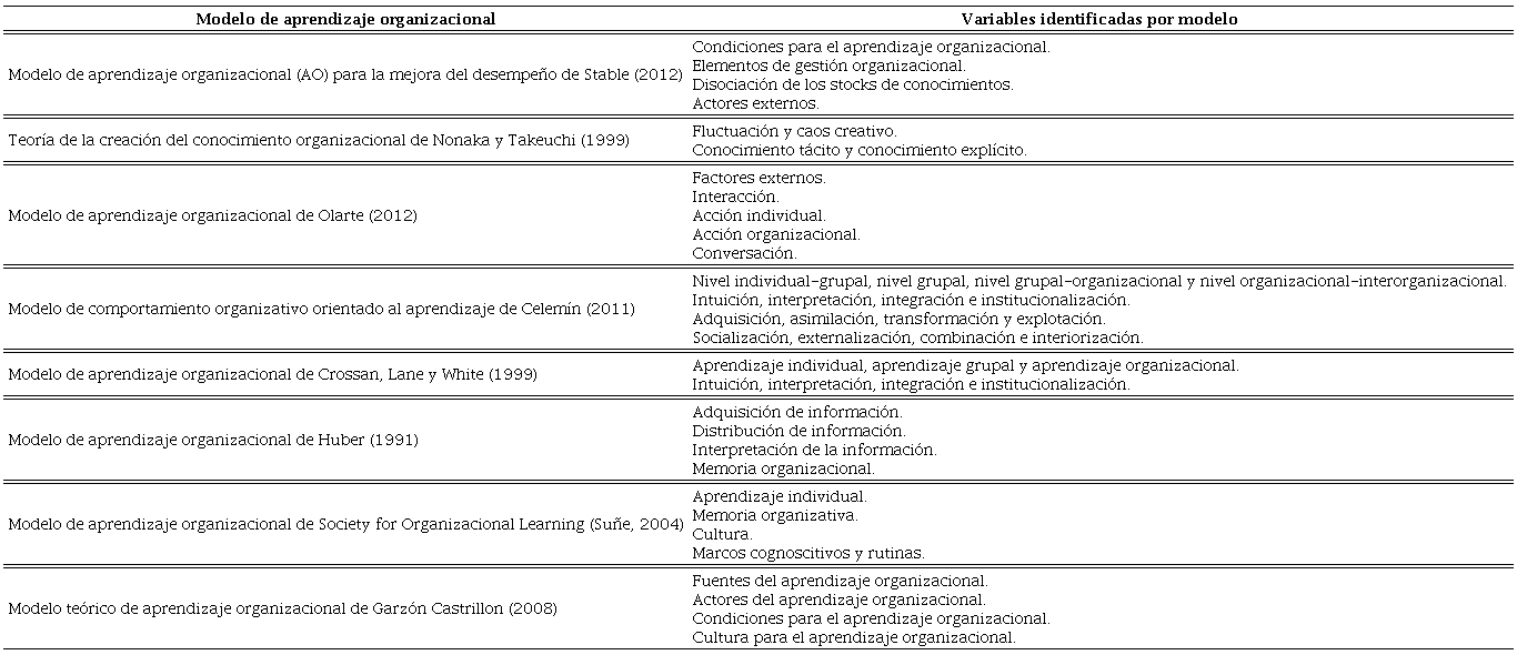 Existen distintos modelos de aprendizaje organizacional constituidos por una gran variedad de dimensiones y variables. Sin embargo, todos estos persiguen el mismo objetivo, que es representar de manera gráfica cómo las organizaciones deben operar los distintos mecanismos que inciden en dichas variables para, de esta manera, dar lugar al aprendizaje organizacional.