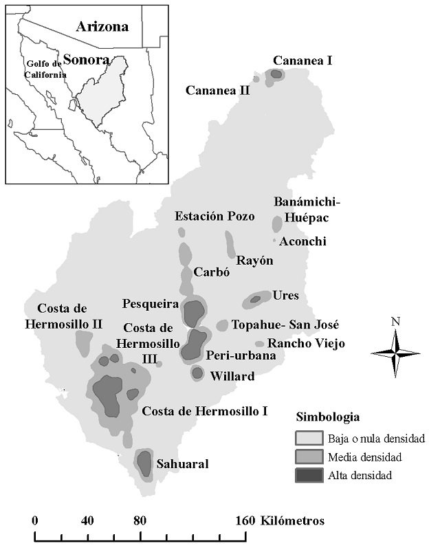 Se seleccionaron dos áreas de estudio: la región de Ures y el área periurbana de Hermosillo, porque forman parte de las siete áreas con mayores densidades de extracción de agua subterránea, de acuerdo con un estudio geográfico realizado con datos de 2014 (Díaz-Caravantes et al., s/f). Además, en estas dos áreas están las localidades con mayores casos de contaminación por arsénico (Díaz-Caravantes et al., 2021); es decir, en ellas hay dos situaciones de amenaza a la seguridad hídrica: el desabasto de agua por la alta extracción y la contaminación del agua.