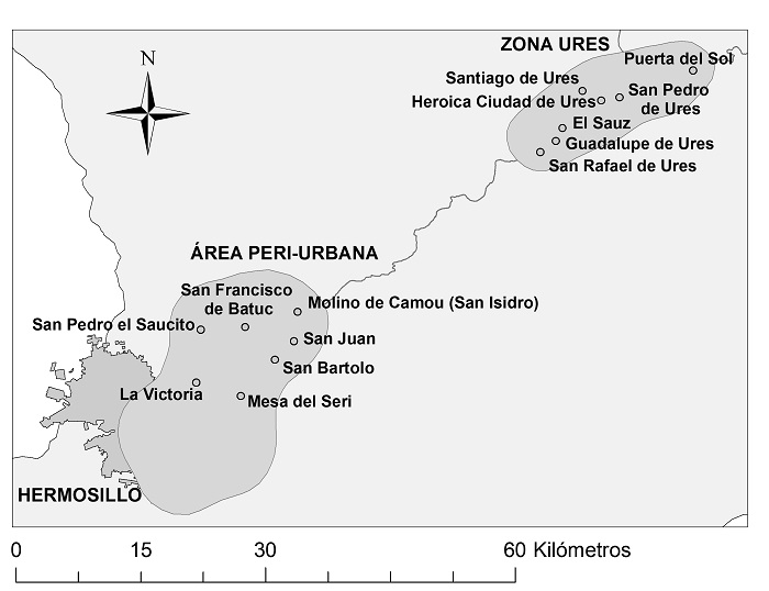 En tal sentido, en este estudio se busca esclarecer las particularidades en ese nivel. Desde la perspectiva de sus principales usuarios, nos proponemos determinar los problemas, las amenazas y las vulnerabilidades más significativos, tanto en el agua para uso agrícola como para consumo público urbano, en comunidades del municipio de Ures y en la zona periurbana de Hermosillo, dentro de la cuenca del río Sonora. El término periurbano hace referencia a un lugar que se encuentra cerca de un centro urbano, pero a la vez conserva ciertas características rurales, por lo que se encuentra inmerso en un proceso en el cual se interrelacionan bienes y servicios entre las zonas rurales y las urbanas (Díaz-Caravantes y Wilder, 2014).